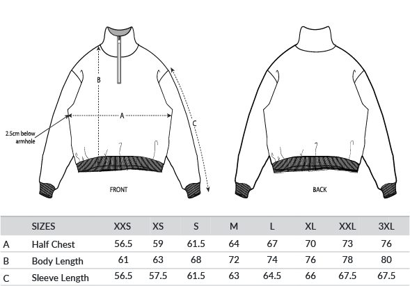 Set-in sleeve. Neck collar in self-fabric. Herringbone tape at inside back neck and at inside of zip. Quarter zip at centre front. 2x1 rib at sleeve hem and bottom hem. Armhole, sleeve hem and bottom hem with twin-needle topstitch. GOTS certified. Fairwear certified. Vegan certified.